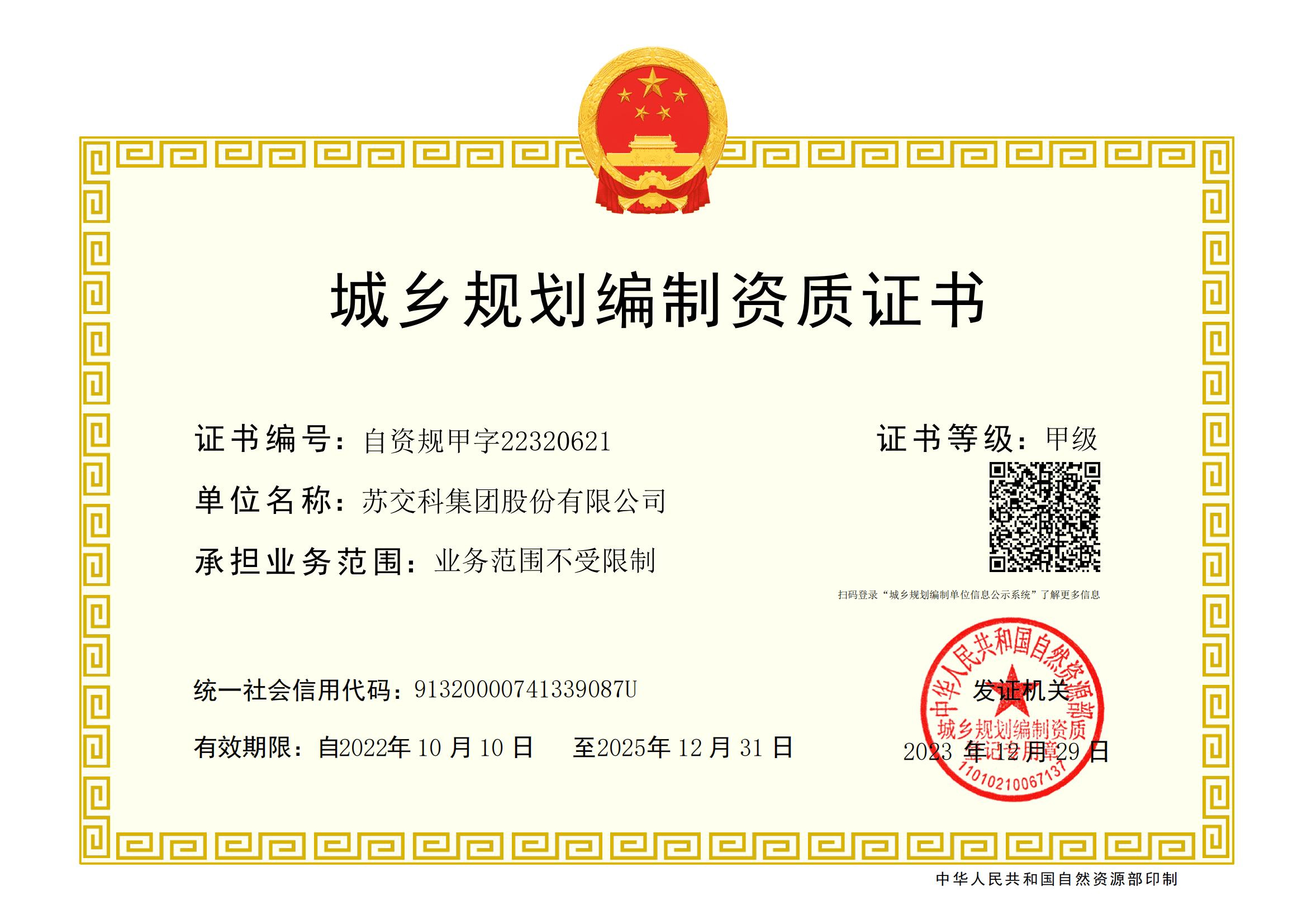 城鄉規劃編制資質證書甲級