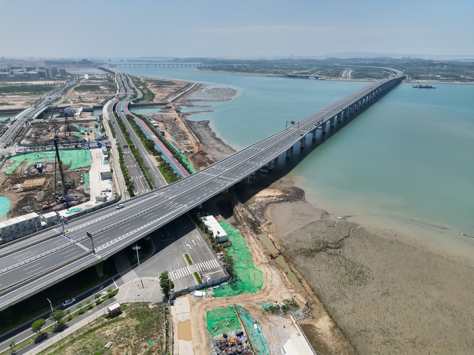 溪東路(翔安南路-機場快速路段)全長6公里,由陸地高架橋、跨海大橋與3座互通立交群組成,構建了多層次交通體系,高架層主路以快速路標準實現高效通行,地面輔路銜接城市主干網;1.3公里雙層跨海大橋驚艷亮相—上層機動車道流暢通達,下層專屬慢行系統串聯兩岸,獨特橋梁造型獲得外觀專利,打通大嶝島慢行交通脈絡。三大互通立交群暗藏巧思:茂林、東園互通以全互通設計實現快速路無縫轉換,蟳窟 Y 型立交精準銜接機場動線,通過交通模型分析與主輔系統分離設計,在復雜城區環境中破解了車流交織難題。創新應用無砂真空預壓工藝,攻克深厚淤泥地基處理難題。