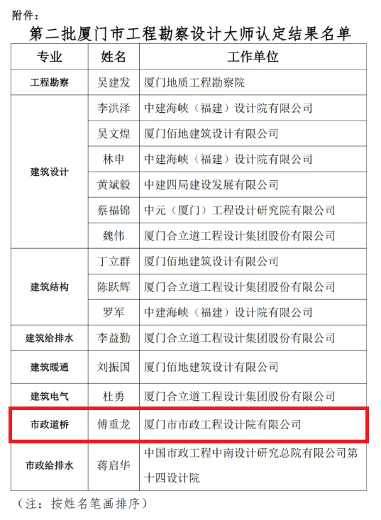 為充分發(fā)揮廈門市工程勘察設(shè)計(jì)行業(yè)領(lǐng)軍人才的示范引領(lǐng)作用,由廈門市住房和建設(shè)局指導(dǎo)、廈門市勘察設(shè)計(jì)協(xié)會(huì)組織開展的第二批“廈門市工程勘察設(shè)計(jì)大師”認(rèn)定工作,經(jīng)工作組嚴(yán)格評(píng)審,最終確定15人獲此殊榮。其中,集團(tuán)旗下廈門市政院副總經(jīng)理傅重龍成功入選,被授予該稱號(hào)。